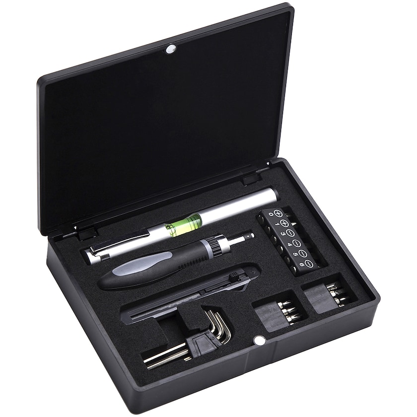 Elegante Box mit dem wichtigsten Werkzeug für Heimwerker. Ein perfektes Werbegeschenk für Unternehmen in der Immobilienbranche. Das Logo wird aufgelasert.