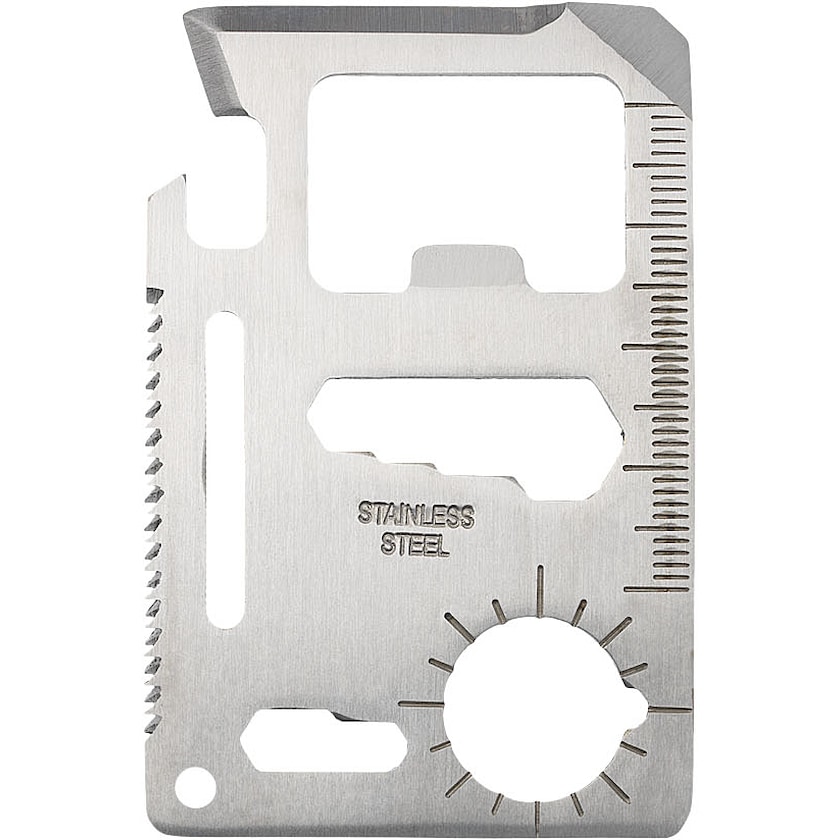 Werkzeugkarte aus rostfreiem Stahl mit 15 Funktionen. Die Karte wird in einer hübschen Hülle aus Kunstleder geliefert.