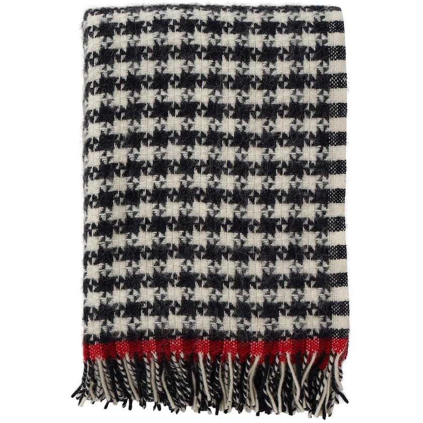Lammwolldecke mit Hundezahnmuster. Lammwolle ist ein natürliches Material, das wärmend und von Natur aus schmutzabweisend ist. Ideal für das Sofa.