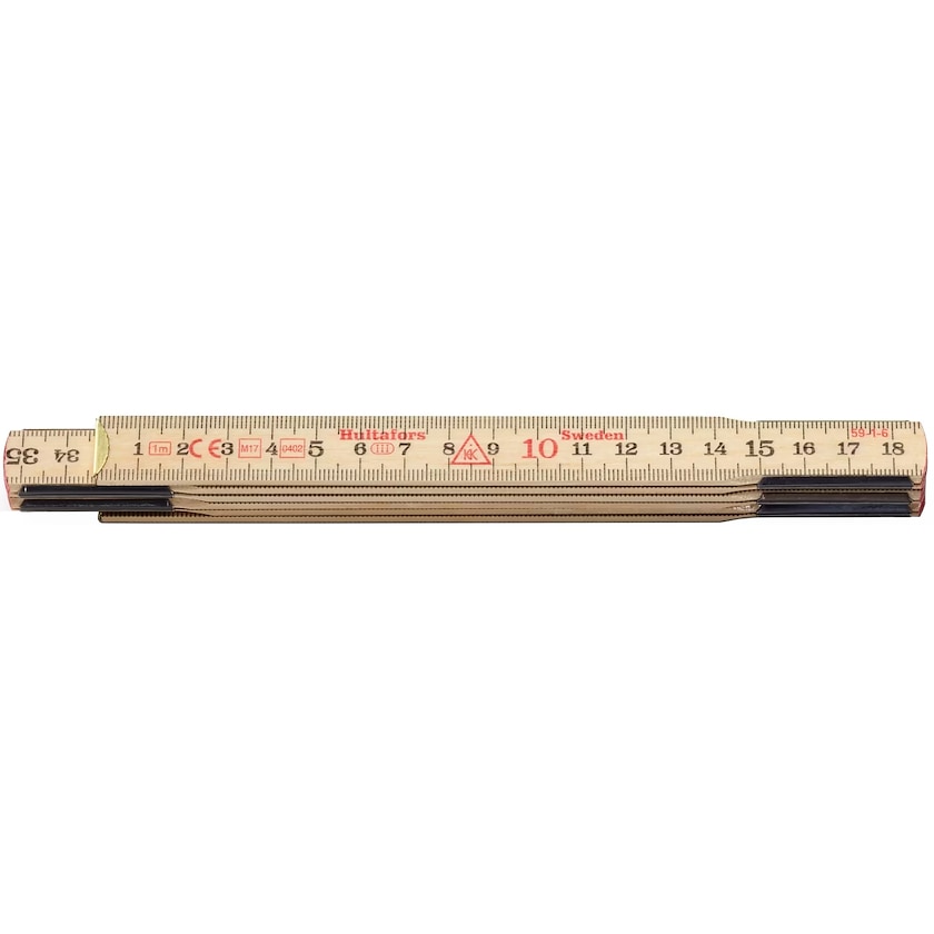 Hultafors' zeitloser Zollstock in der 1-Meter-Version. Der Zollstock besteht aus Glasbirke mit Gelenken aus schwedischem Stahl. Die metrische Skala ist schwarz mit roten Dezimeterzahlen und befindet sich auf beiden Seiten.