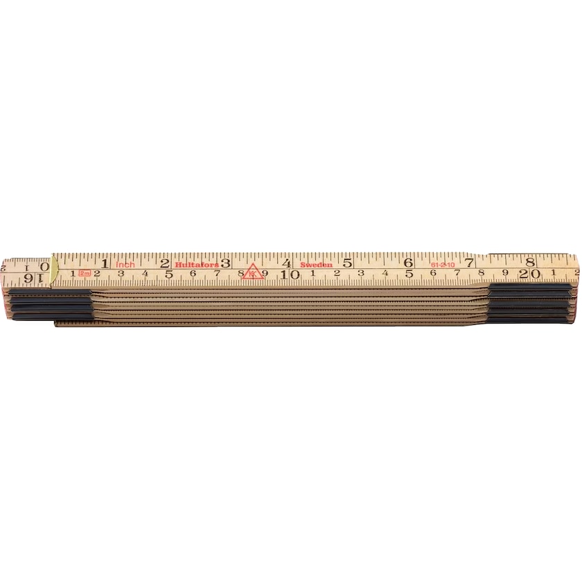Klassischer Zollstock aus Birke und schwedischem Stahl. Abstufung mit schwarzen Ziffern auf beiden Seiten, metrisches Maß auf der Unterkante, englische Zoll auf der Oberkante.