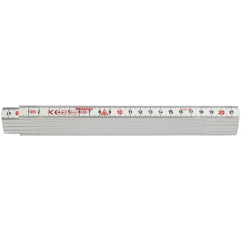 Zollstock aus strapazierfähigem glasfaserverstärktem Polyamid. Das Material hat eine ausgezeichnete Feuchtigkeitsbeständigkeit. Der Zollstock hat beidseitig schwarze metrische Einteilungen mit roten Dezimeterzahlen. Die Mindestbestellmenge beträgt 300 Stück.