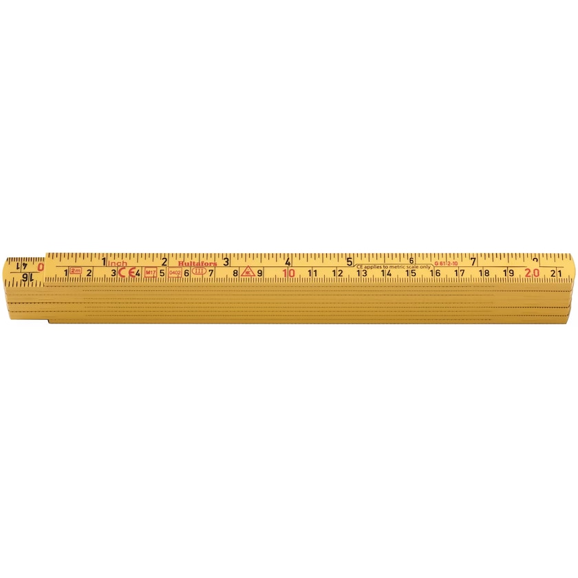 Gelber Zollstock aus glasfaserverstärktem Polyamid. Das Material hat eine ausgezeichnete Feuchtigkeitsbeständigkeit. Der Zollstock hat auf beiden Seiten Skalen mit schwarzen Zahlen. Metrische Skala an der unteren und englischer Zoll an der oberen Kante.